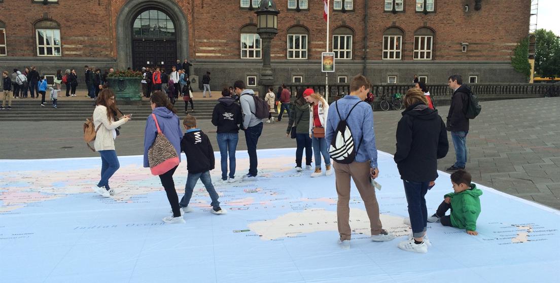 Miles de personas conocen más de cerca a Miguel de Cervantes en un mapa gigante que representa su Vida y Obra. El Mapa, de carácter interactivo, ha permanecido tres días en la plaza del Ayuntamiento, uno de los lugares más turísticos de la ciudad. El embajador de España en Dinamarca, Enrique Pastor de Gana, y el consejero cultural, Raúl Muñoz Beltrán, han asistido a la actividad.